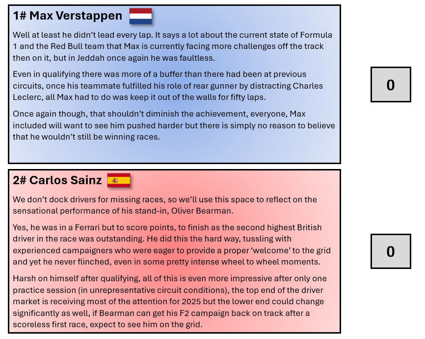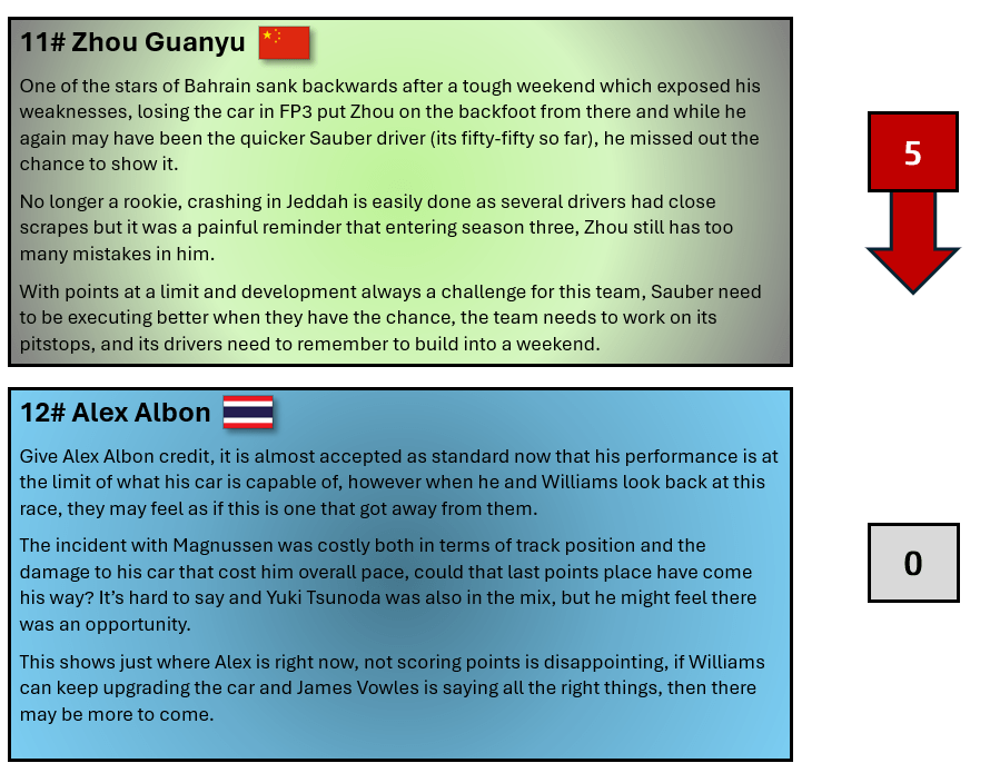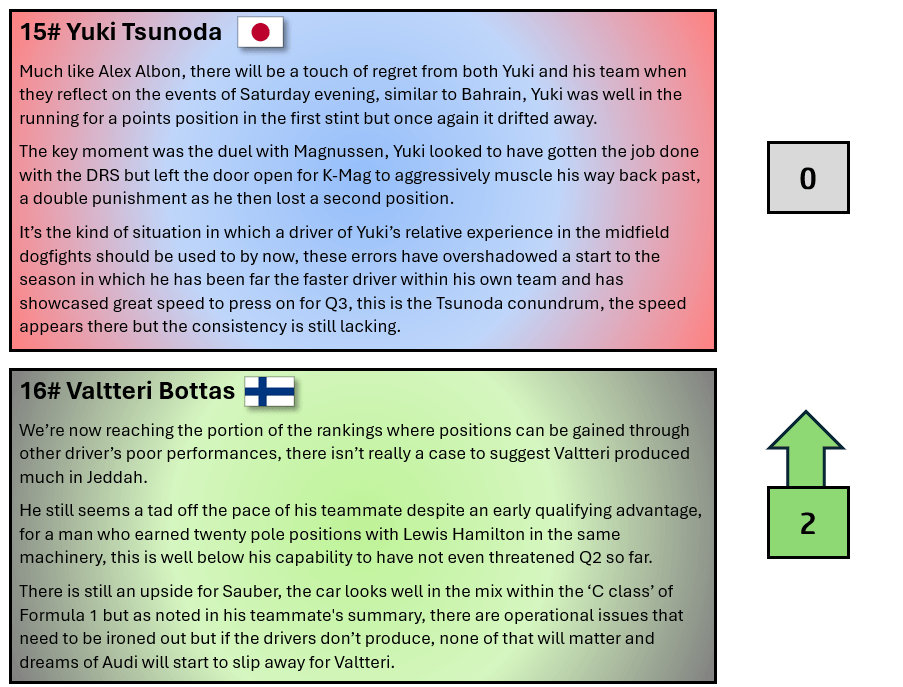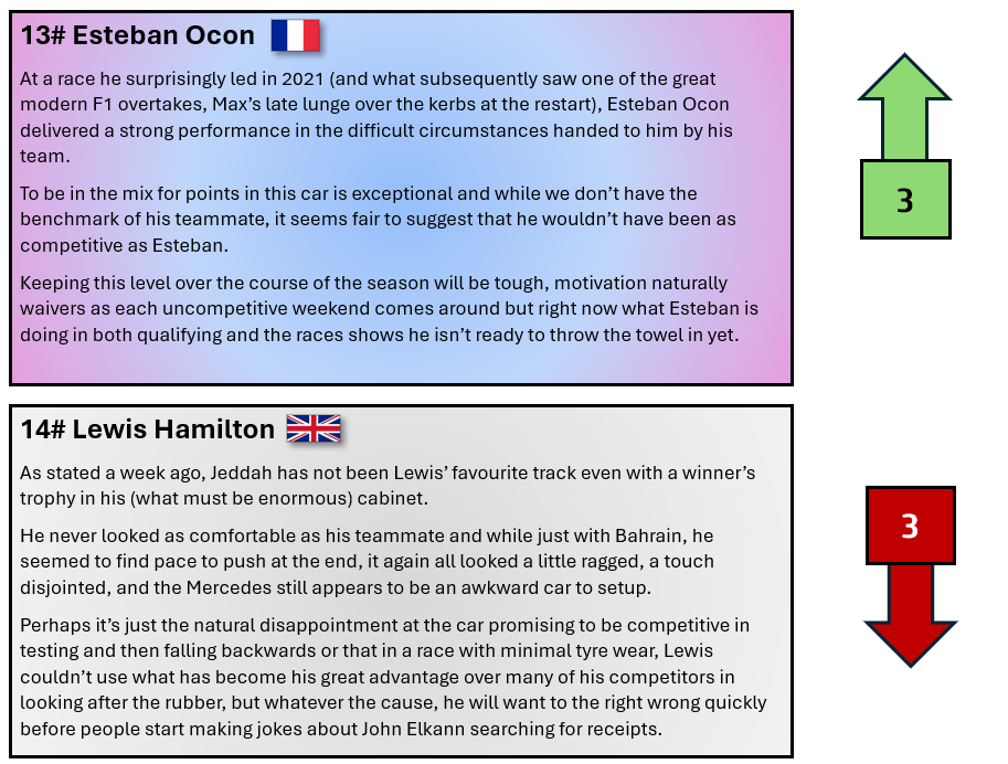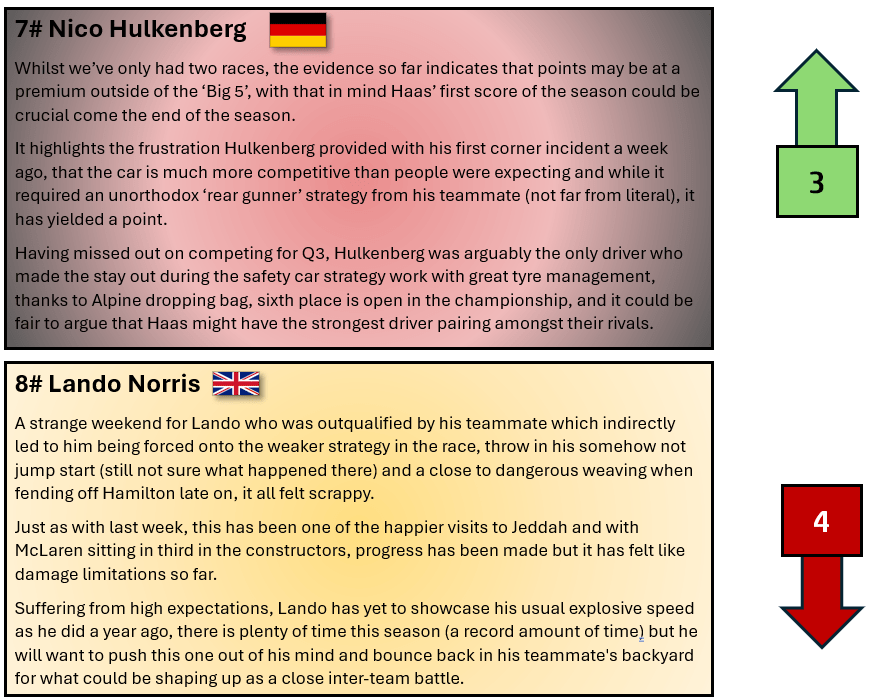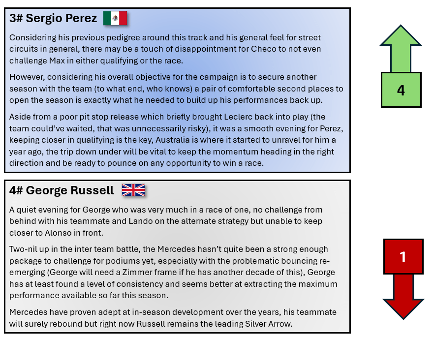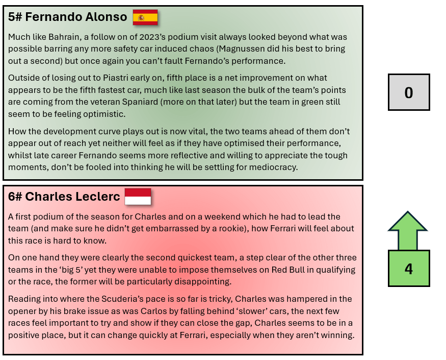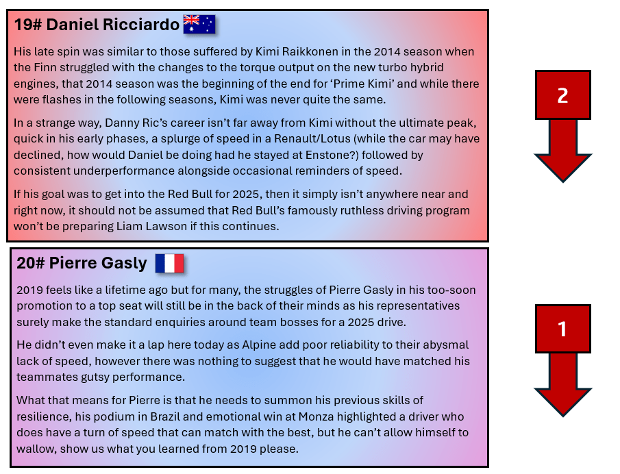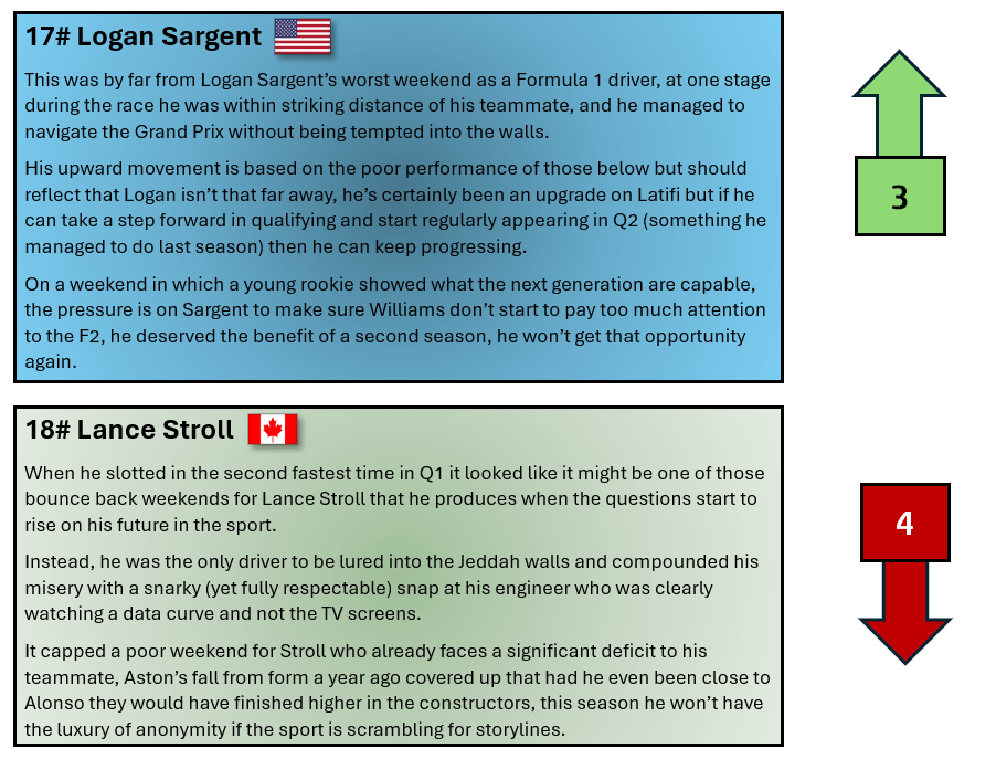 That doesn’t distract from the twenty drivers below still needing to do their jobs, we had one star cameo from young Ollie Bearman which really indicates that the grid needs to find a way to get the best young talents out there (an extra team? cough* Andretti cough*), that’s where this sports true talents lay.