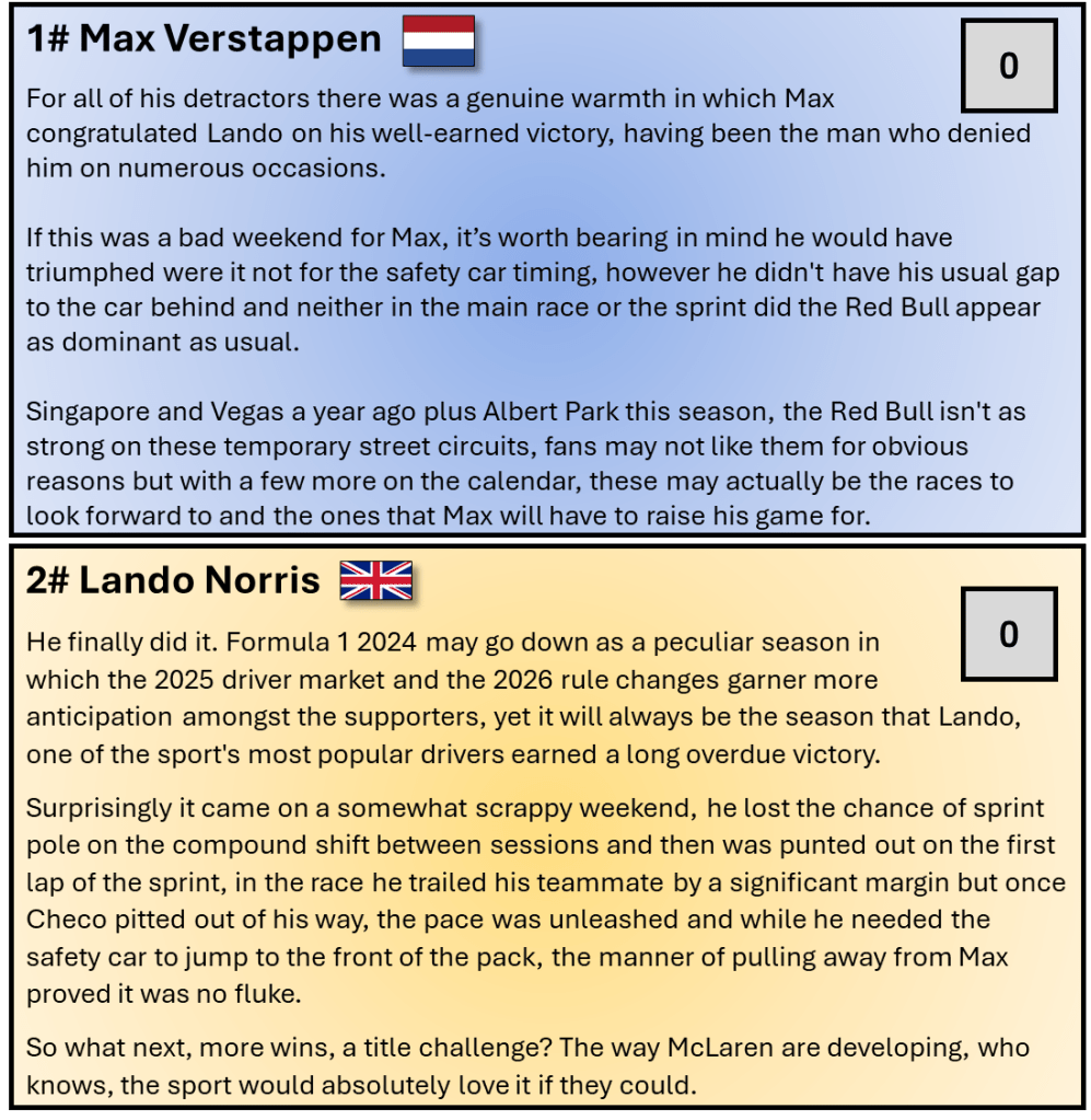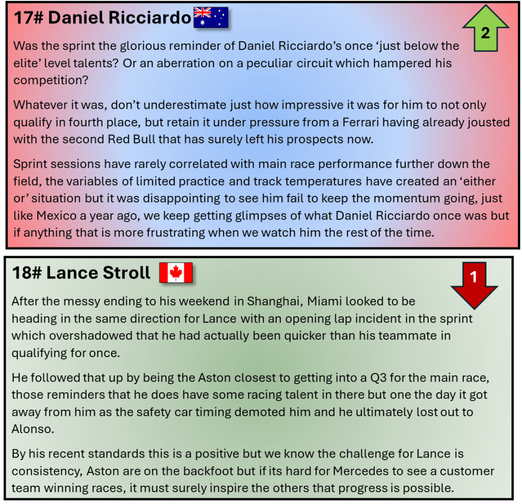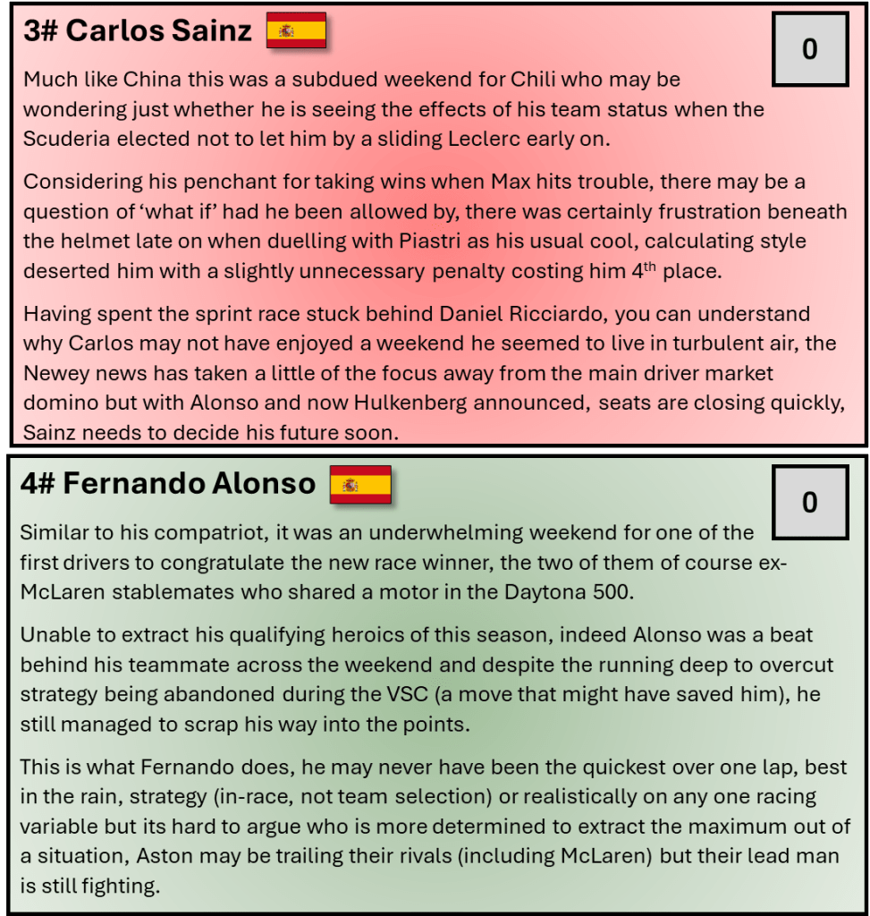 These type of street circuits are not on the top of many F1 fans favourite tracks but as Miami showed and Singapore, Baku, Vegas and even Monaco (had Alonso pitted at the right time), it can mix the order up and cause issues for a season’s dominant car.